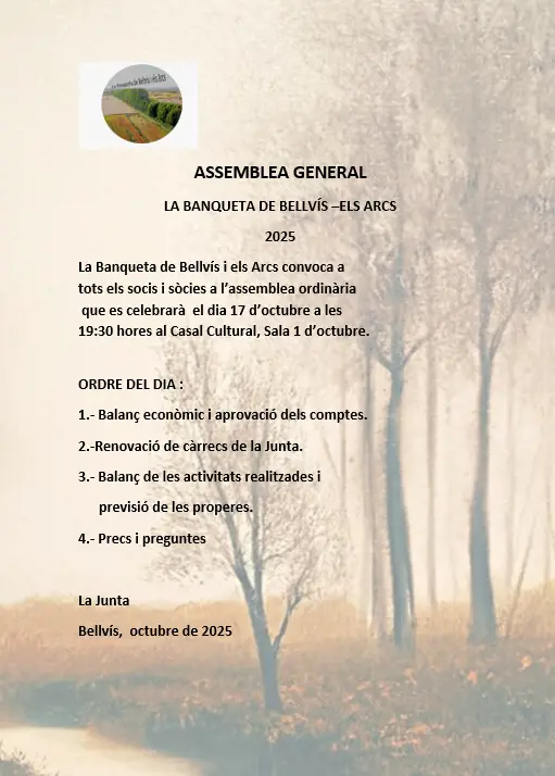 La Banqueta de Bellvis i els Arcs convida a tots els socis i sòcies a l'assemblea ordinària que tindrà lloc demà divendres 17 d'octubre a les 19:30 a la sala 1 d'Octubre del Casal Cultural.