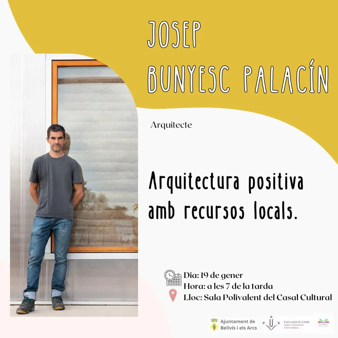 L'Aula Oberta de Bellvís – els Arcs comunica a tots els seus associats que aquest proper dilluns 19 de gener a les 19.00 h i a la sala polivalent del Casal Cultural Sebastià Serrano, tindrà lloc la xerrada Arquitectura positiva amb recursos locals, a càrrec de l'arquitecte i especialista en el tema Josep Bunyesc Palacín.