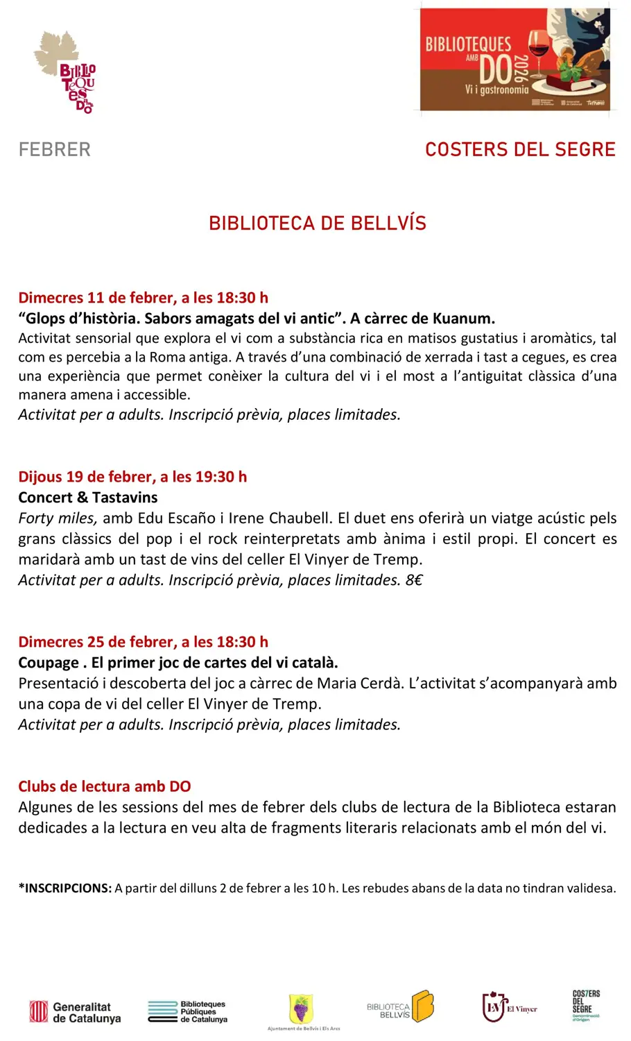 Les inscripcions s’obriran el dilluns 2 de febrer a les 10 h.