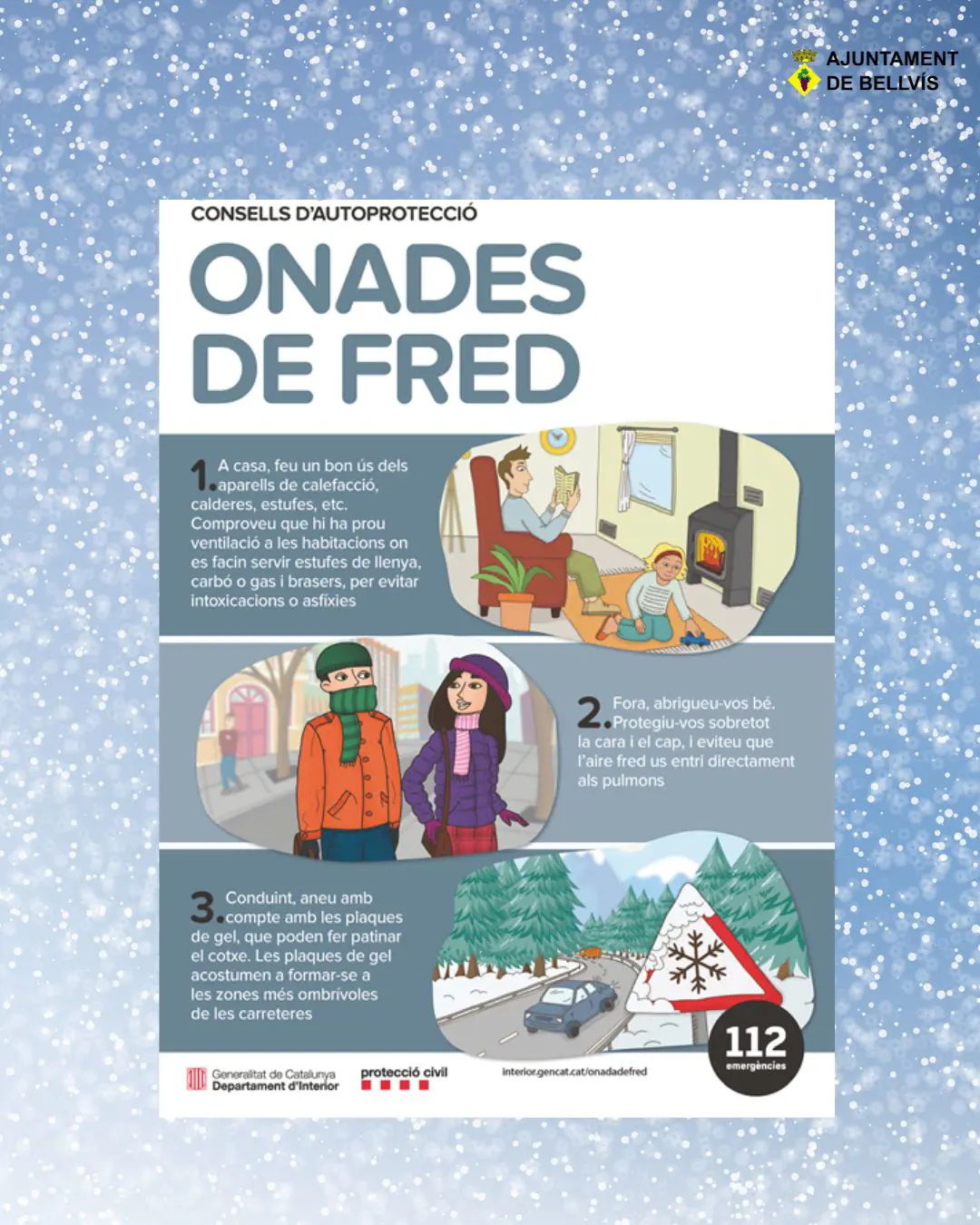 - A casa fer un bon ús dels aparells de calefacció, calderes, estufes, etc. Comproveu que hi ha prou ventilació a les habitacions on es facin servir estufes de llenya, carbó o gas i brasers, per evitar intoxicacions o asfíxies. Si veieu que s'acumula neu a la vorera de davant de casa, escombreu-la cap al carrer.