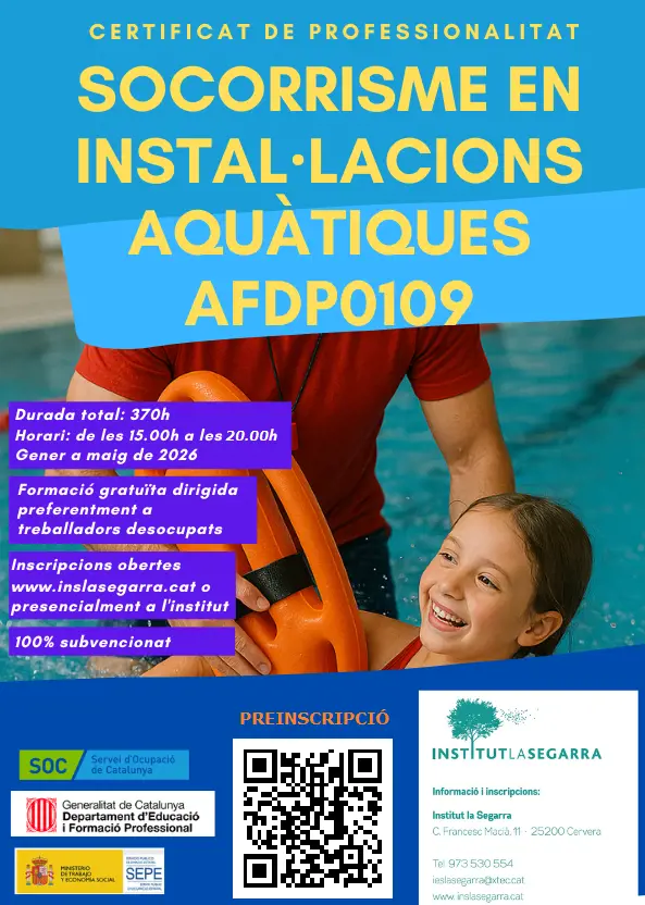 És un Certificat de Professionalitat que dona accés directe al ROPEC i permet treballar com a socorrista aquàtic en piscines des del mateix estiu del 2026. És gratuït!
