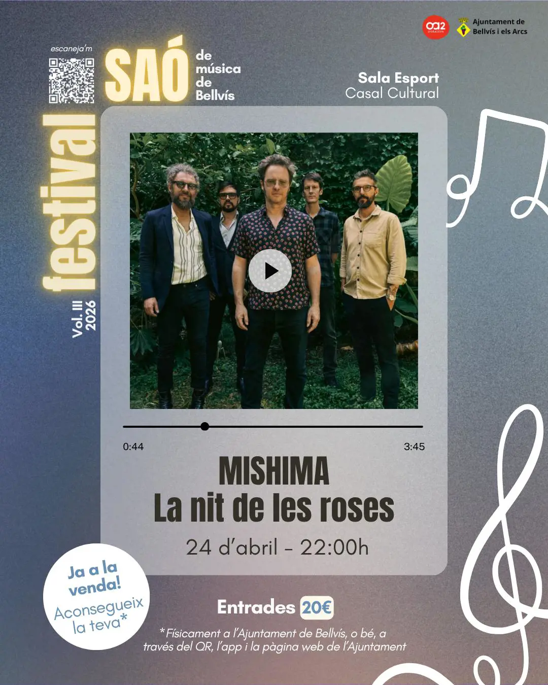 El divendres 24 d’abril del 2026, a les 22 h, a la Sala Esport del Casal Cultural, el Festival Saó de Bellvís Volum III, tanca el festival amb Mishima i la Nit de les Roses.