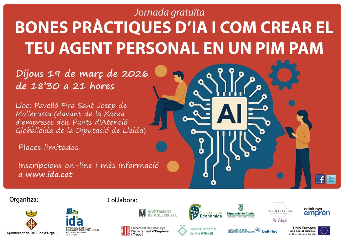 La Incubadora d’Empreses de Bell-lloc d’Urgell i el Punt d’Atenció GlobaLleida Pla d’Urgell organitzen la Jornada gratuïta (1’5h) “Bones pràctiques d’IA i com crear el teu Agent personal d’IA en un pim pam” dins el marc de la Fira “Sant Josep” de Mollerussa.