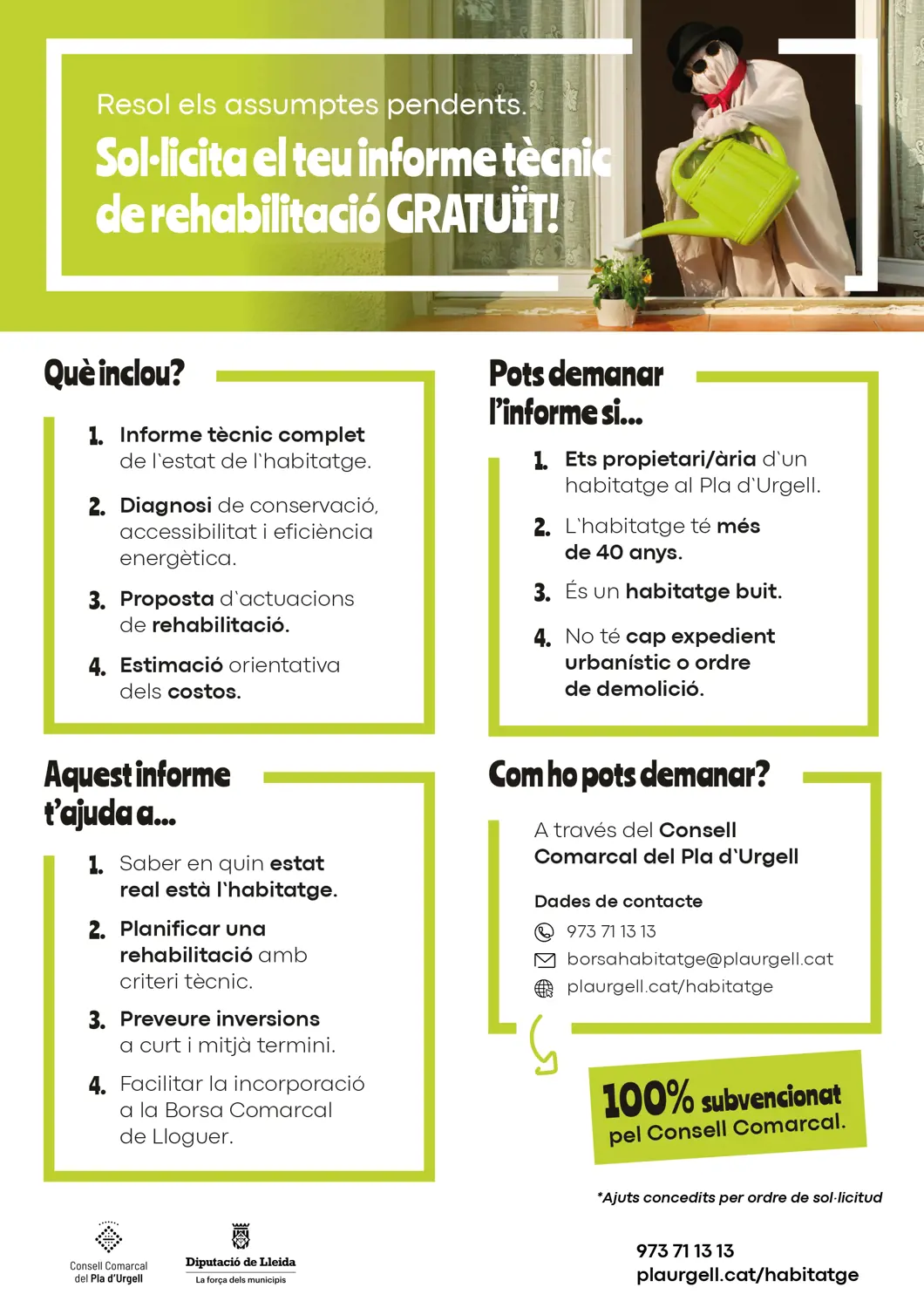 El Consell Comarcal del Pla d'Urgell ha convocat ajuts destinats a la redacció de l’informe tècnic de rehabilitació d’immobles situats a la comarca, adreçats a totes aquelles persones que siguin propietàries d’un habitatge buit d’ús residencial a la comarca.