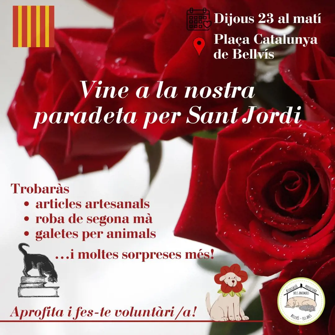 Des de l’Associació d’Animals de Bellvís i Els Arcs us volem informar que, amb motiu de la diada de Sant Jordi, els propers dijous 23 d’abril i diumenge 26 d’abril disposarem de la nostra parada solidària.