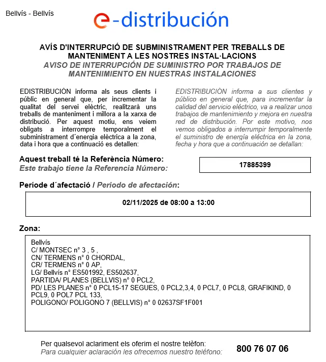 ENDESA comunica que el dia 2 de novembre, entre les 8.00 h i les 13.00 h hi haurà un tall de llum a la zona de la carretera de Tèrmens.