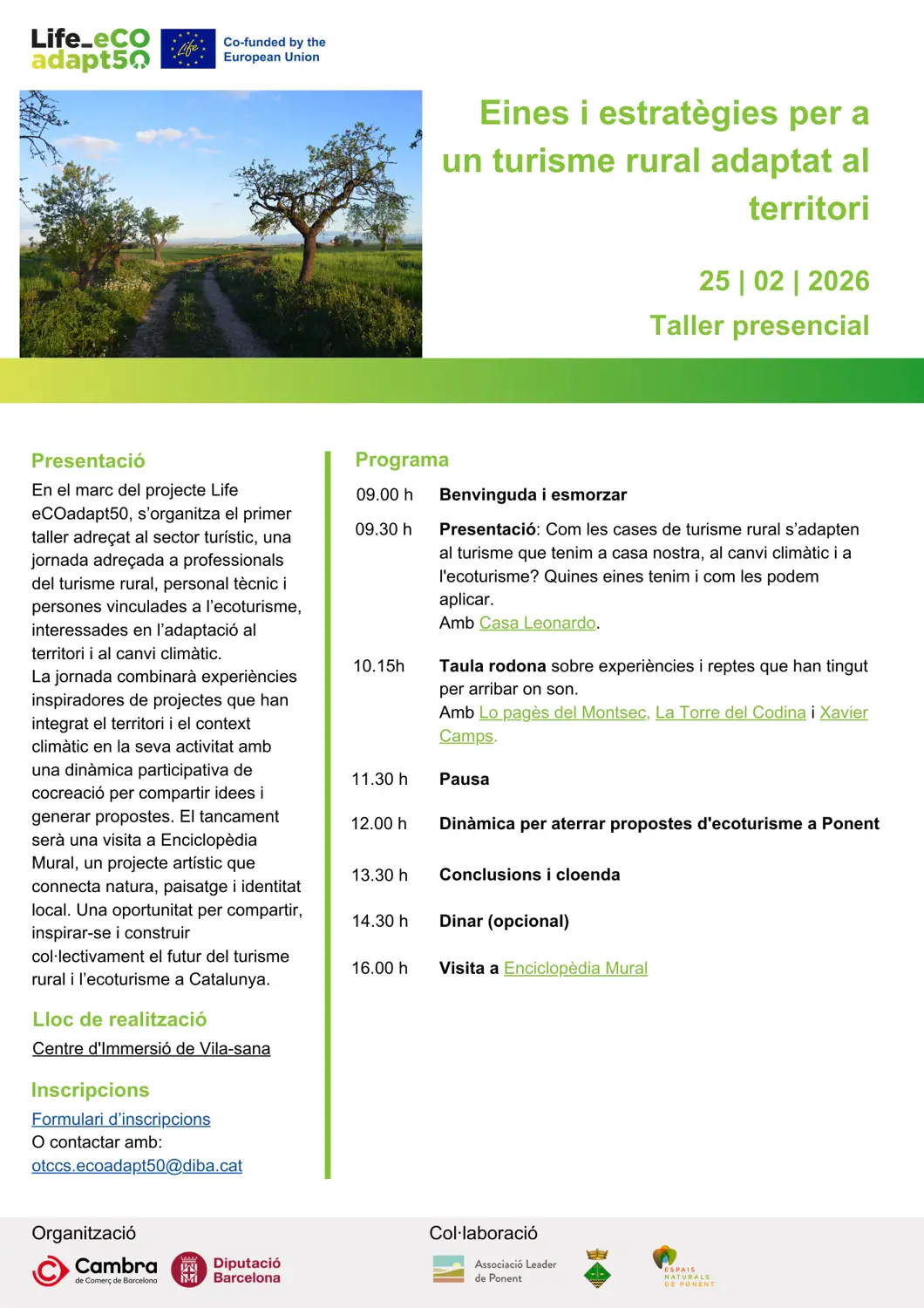 Des de l'Associació Leader de Ponent ens complau convidar-te al primer taller adreçat al sector turístic del projecte Life eCOadapt50, en format presencial, titulat "Eines i estratègies per a un turisme rural adaptat al territori".