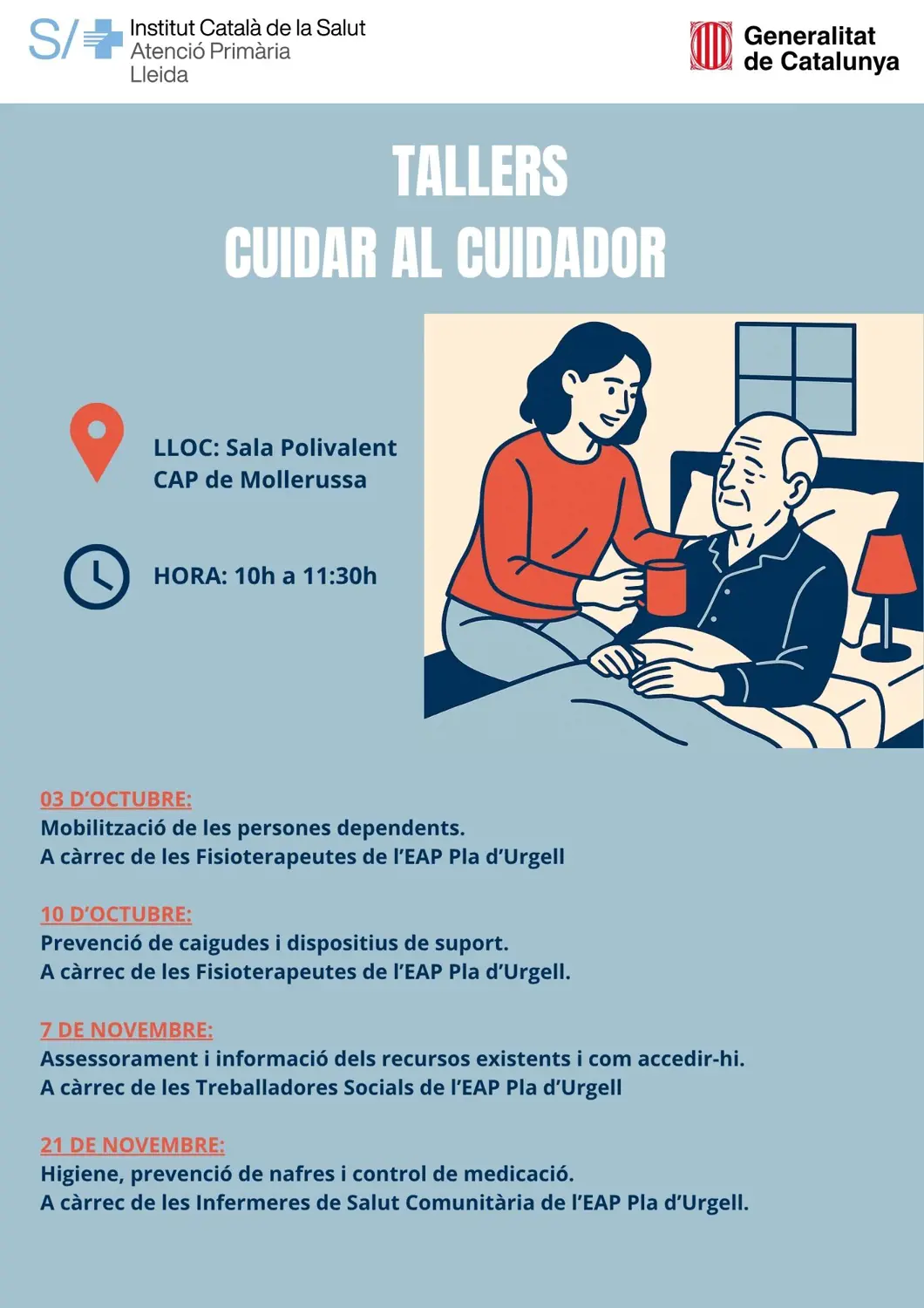 Els Tallers es faran els divendres 3 i 10 d'octubre i el 7 i 21 de novembre de 10.00 h a 11.30 h a la Sala Polivalent del CAP de Mollerussa.