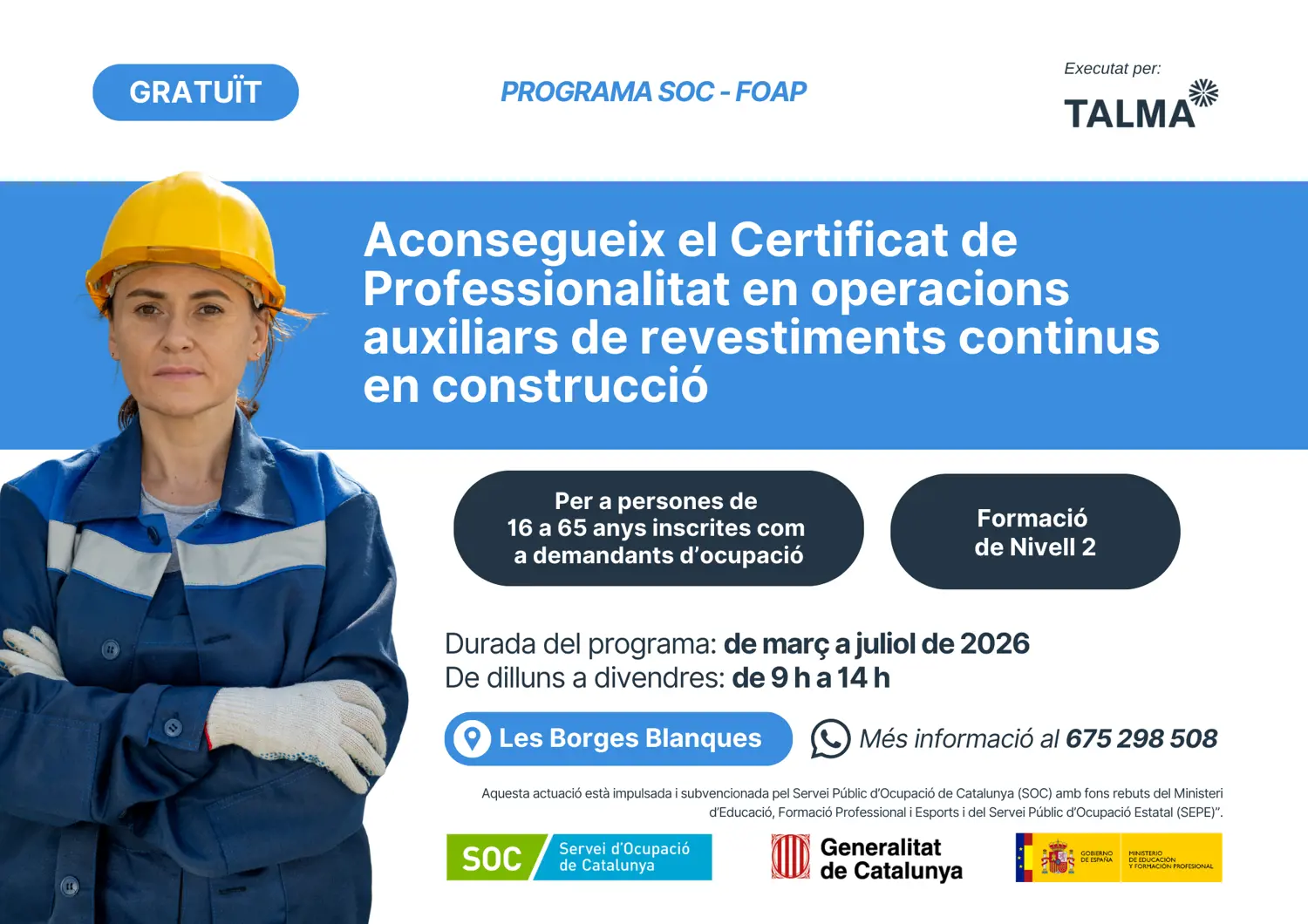 NOVETAT D'AQUEST 2026! Certificat de Professionalitat de Nivell 2 en operacions auxiliars de revestiments continus en construcció.