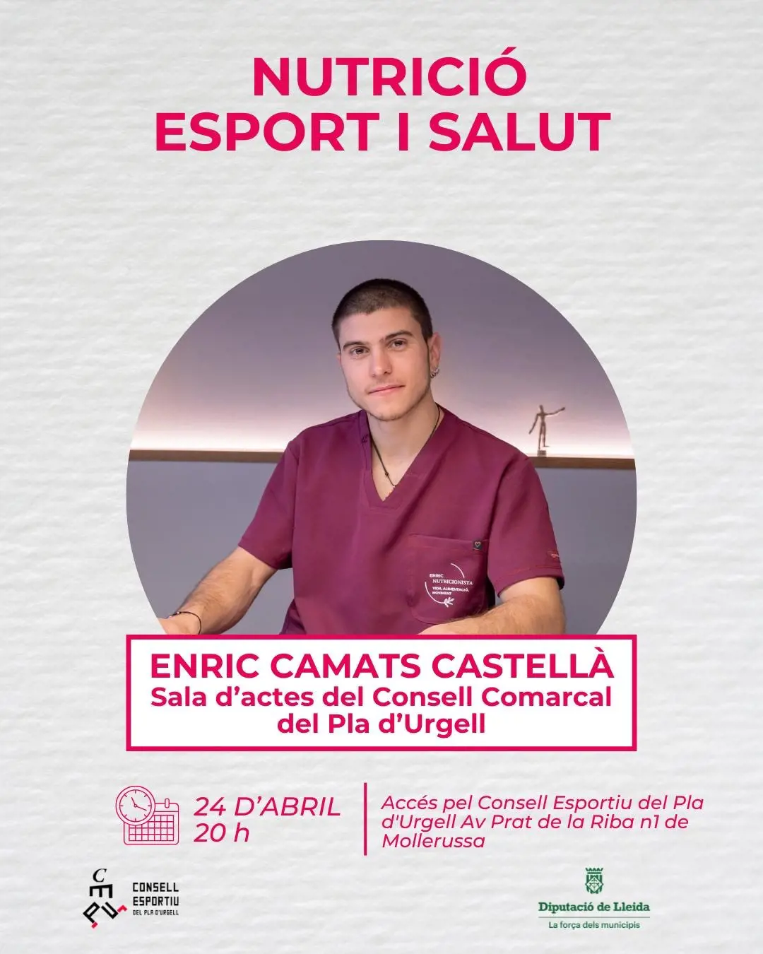El dietista-nutricionista especialitzat en nutrició esportiva Enric Camats, combina la pràctica clínica amb la docència universitària i la divulgació en xerrades i tallers sobre alimentació i hàbits saludables.
