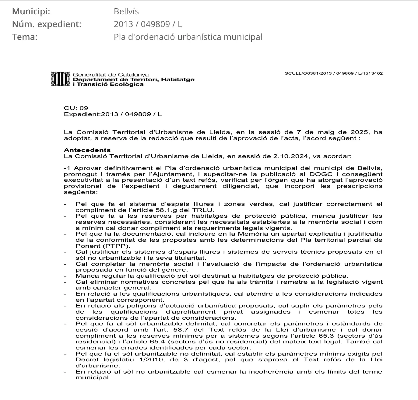 Després d’anys de feina tècnica, tramitacions administratives i aportacions institucionals, Bellvís ja té aprovat el seu nou Pla d’Ordenació Urbanística Municipal (POUM). Aquest instrument és clau per al futur urbanístic del poble, ja que defineix com ha de créixer i transformar-se el municipi durant els pròxims anys. L’acord de la Comissió Territorial d’Urbanisme de Lleida es va formalitzar el passat 7 de maig de 2025, tal com recull l’edicte publicat avui al Diari Oficial de la Generalitat de Catalunya (DOGC núm. 9448).